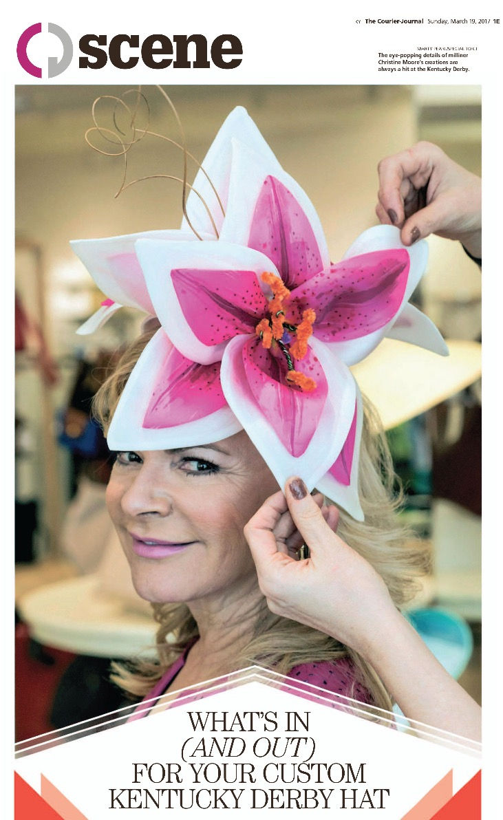 So skilled are this duo in styling that I was freed up to do an interview with long-time friend and colleague Kirby Adams, Fashion Editor of Courier Journal of Louisville. Kirby has been covering my work for years starting when she was a correspondent for WHAS11. She has talked fashion with me, written about me, emceed and co-emceed with me, and has worn my hats for years. She has watched my designs for Derby evolve and grow as well as my team’s skills. This time, we spoke about what trends I was seeing from the NYC fashion district where I am based, as well as what I am hearing from the stores that I sell to. We rounded up the discussion with what I am seeing regarding styles for this year’s 143rd running of the Kentucky Derby. (I love saying the year – there is much history in this event and American horse racing in general, and it is humbling to think of that many years.) We spoke at length about the process of how my staff and I create the hats, and how we go about designing something specifically for someone. We talked about my desire for people who know they are going to Derby to start early, which rarely happens.